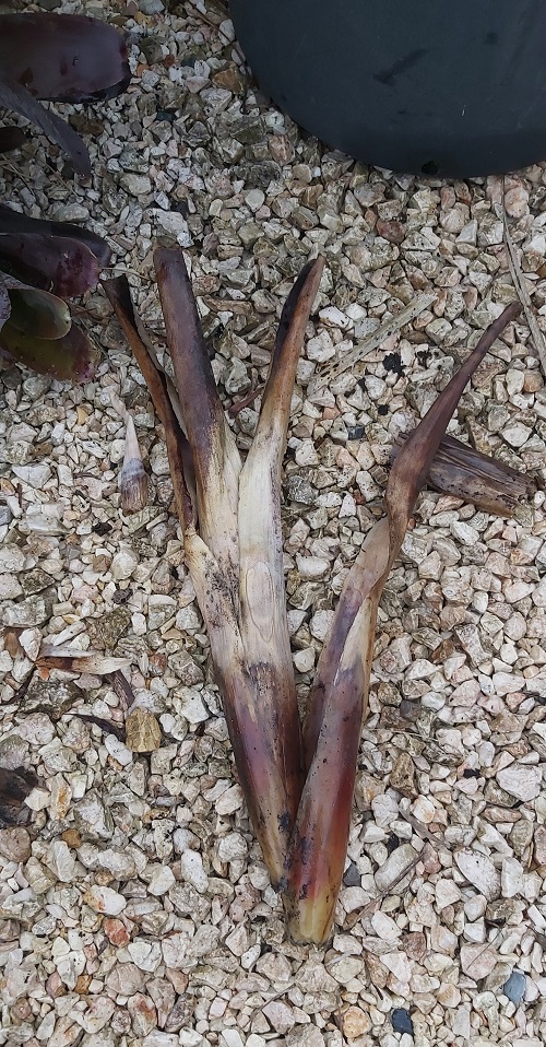 This Bromeliad grows outside. Unfortunately, due to the continuous rain, the trumpets are collecting and holding too much water, rotting and dying off more than usual. Today (Monday), I removed all the rotting trumpets from all three clumps. This task involved quite a lot of yanking and stretching so no more gardening today.