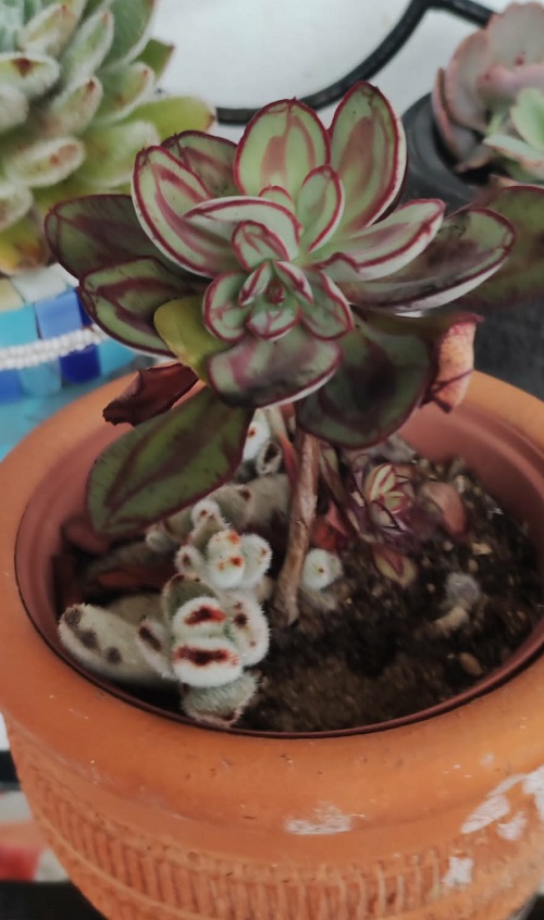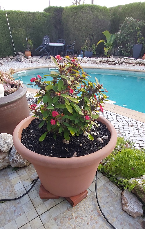 On Sunday, we repotted the Crown of Thorns and added more soil. The blackbirds are little devils and love digging up the soil in their search for worms and bugs. I need to find some stones to prevent them from doing this again.