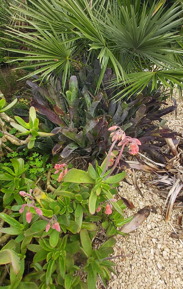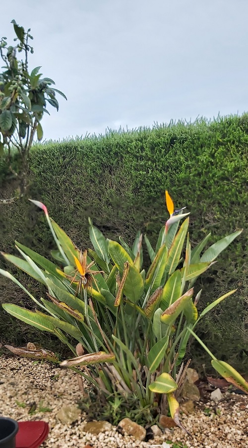 This Bromeliad grows outside. Unfortunately, due to the continuous rain, the trumpets are collecting and holding too much water, rotting and dying off more than usual. Today (Monday), I removed all the rotting trumpets from all three clumps. This task involved quite a lot of yanking and stretching so no more gardening today.