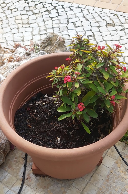 On Sunday, we repotted the Crown of Thorns and added more soil. The blackbirds are little devils and love digging up the soil in their search for worms and bugs. I need to find some stones to prevent them from doing this again.