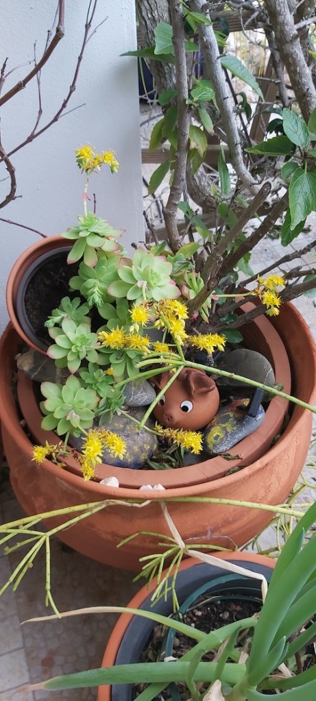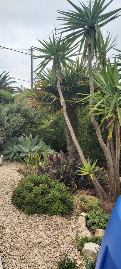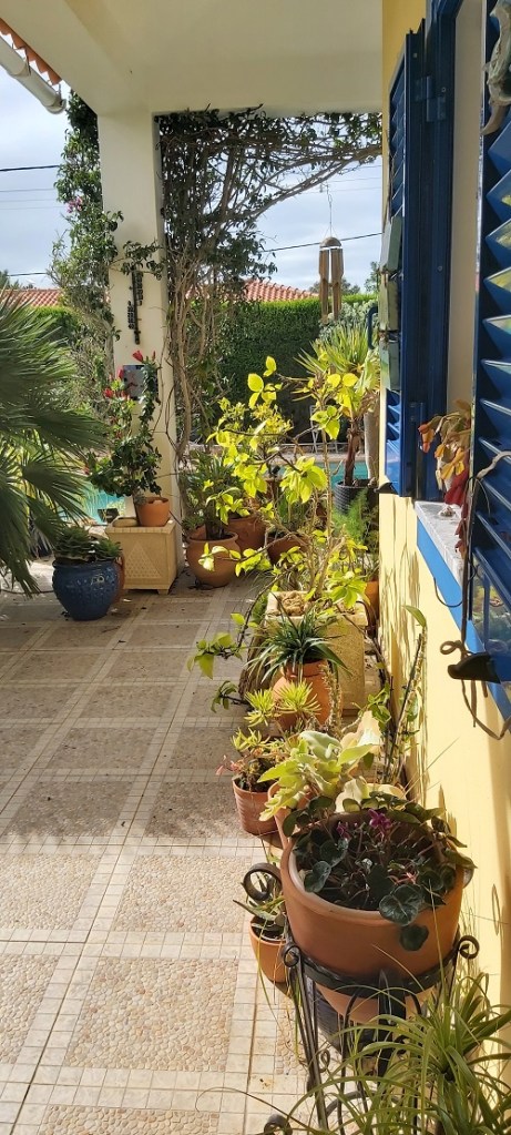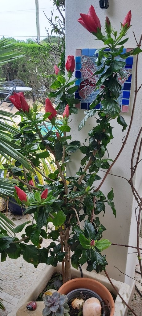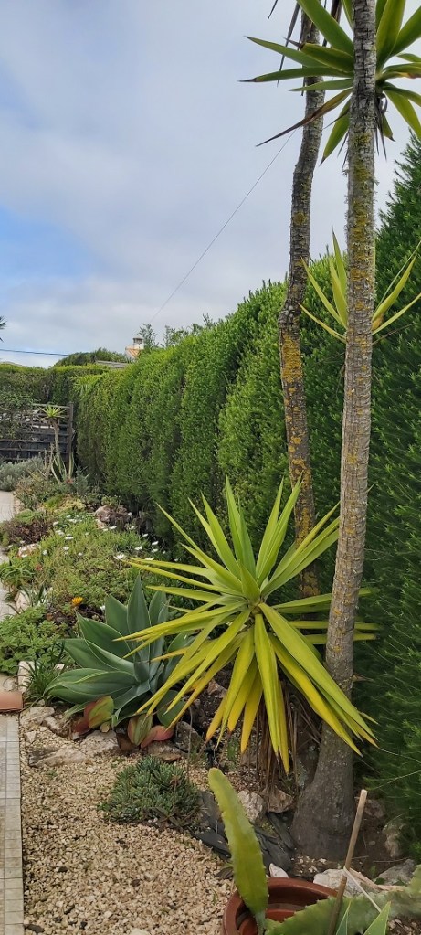 Comparing pictures of different areas of our garden, there have been no significant changes since my January review. The gale-force winds and heavy rains continued for the first couple of weeks, which stripped the bougainvillaea of most of its leaves, and several succulents were pitted with what I can only assume were hailstones. The leaves of the hibiscus were also damaged. The 20th of the month saw a turn in the weather, with temperatures reaching 21 °C for a few days, no rain or strong winds, and even a couple of still balmy days, prompting a visit to the beach. As February draws to a close, I hope we were not lulled into believing Spring had arrived!