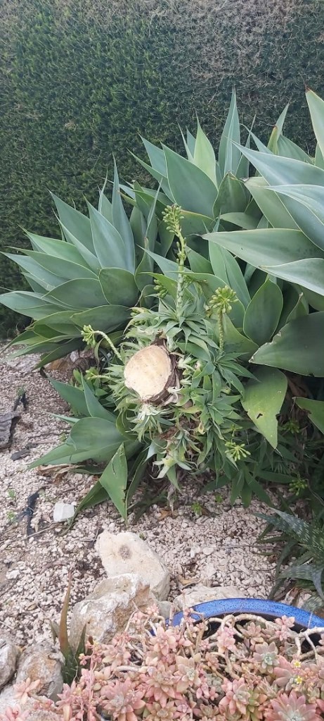 We finally said goodbye to the Agave Attenuata flower as it had grown SO big it was towering across the driveway. I did wait a few days for the cut to dry, and then sealed it with a special wax-like product a friend had gifted me years ago. He used it when pruning trees.