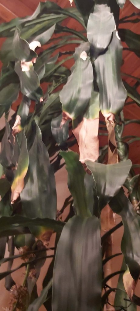 My Dracaena Fragrans is also suffering. We completely repotted with new soil last year and found only a small rootball remained. Hence the rocks to stop it from toppling over.