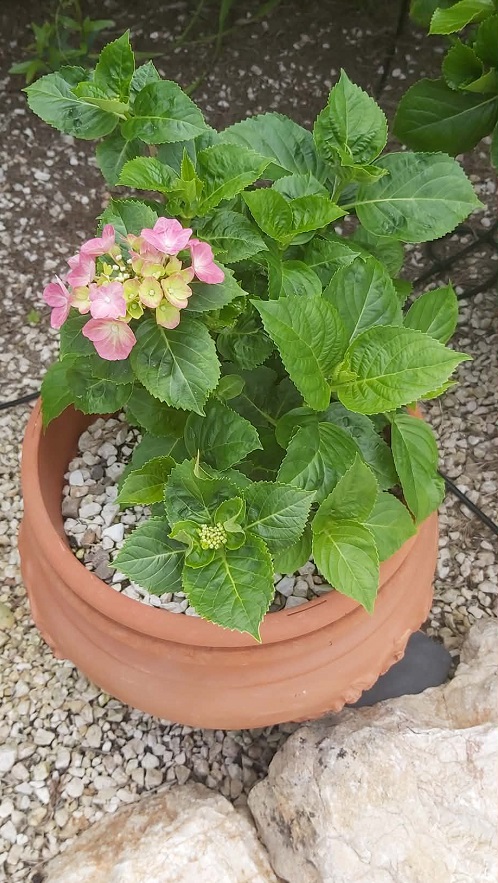 One hydrangea that looked dead a few weeks ago has not only sprouted leaves but is also producing flowers!