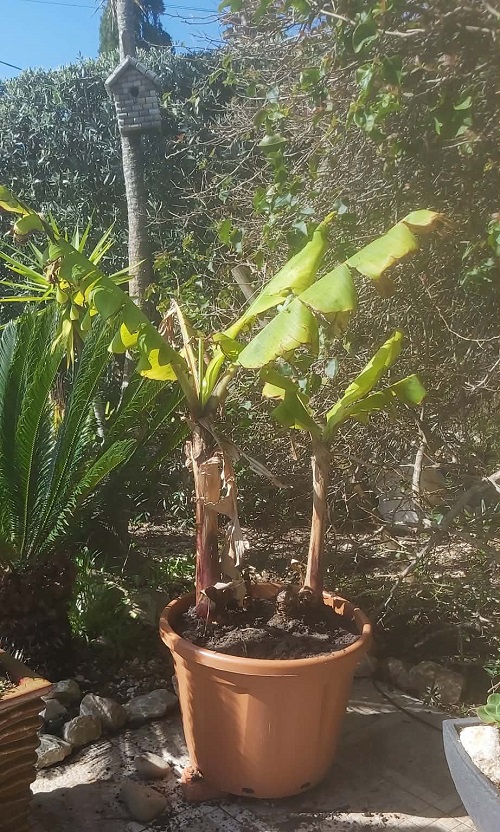 It was quite a task, but somehow using the brain v braun theory, we managed to repot and reposition the larger pot in a more sheltered location beside the bougainvillaea hedge. I used a combination of compost, sandy garden soil, and processed manure to top up the larger pot. Fingers crossed. I find the normal multipurpose compost we have here dries out too quickly and does not hold the moisture in the summer. The combination of all three elements should offer a better solution.