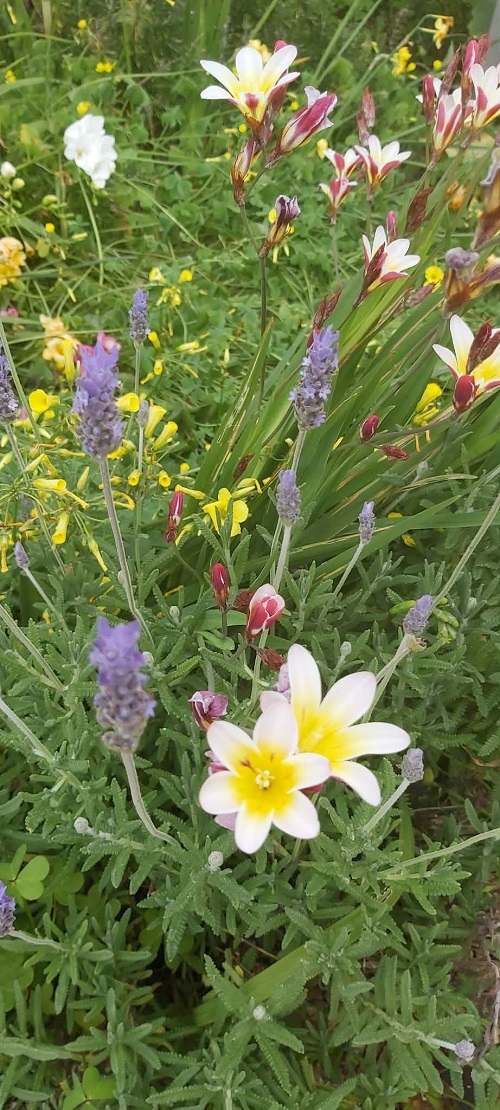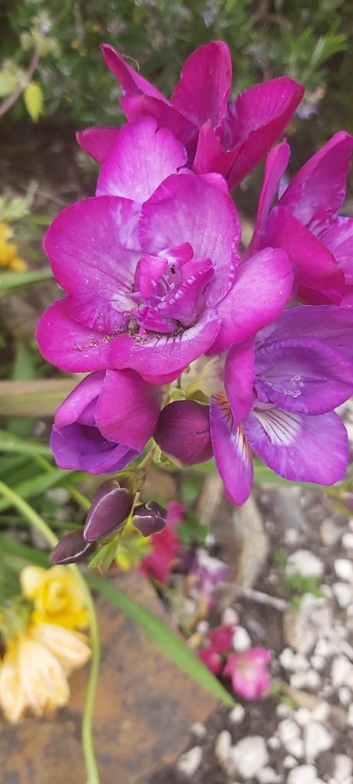 Last autumn I dumped all my pots containing freeisha bulbs on my only soil bed. It was meant to be my herb garden, but the herbs were not really interested in taking root. The garden bed is also overrun with the Oxalis pes-caprae . I’ve tried to dig it up but it seems impossible. I have now renamed this my ‘bee garden’